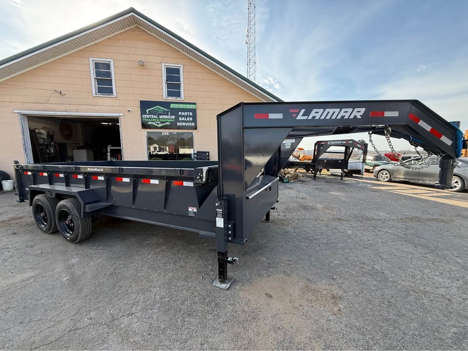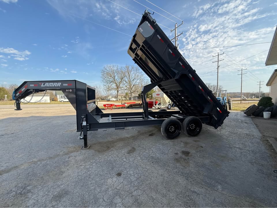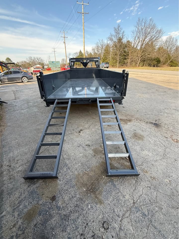 83×16 gooseneck 16k gvwr Spare 17.5 16 ply tire & mount 7 gauge floor Rigid rail Tarp kit Scissor lift Ramps Tarp kit Power up, power down & gravity down for 50% more dumps Cold weather plug 24” sides Financing and delivery options available Out the door price $13,885 No hidden fees call or text [hidden information] or send a dm thanks.