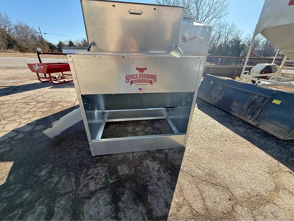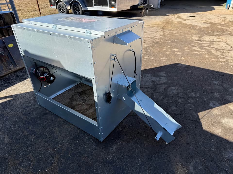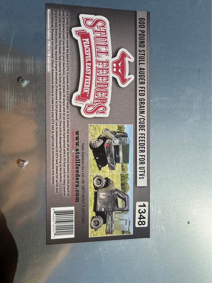 Brand new Stull Feeders auger fed grain/cube feeder. This thing is ready to go for your UTV! Holds up to 600 lbs of whole corn. Has a 4-inch auger and 12V motor. Dimensions are 30w x 43d x 39h. Empty weight is 220 pounds. Sits right in your UTV bed. Super easy for feeding time!